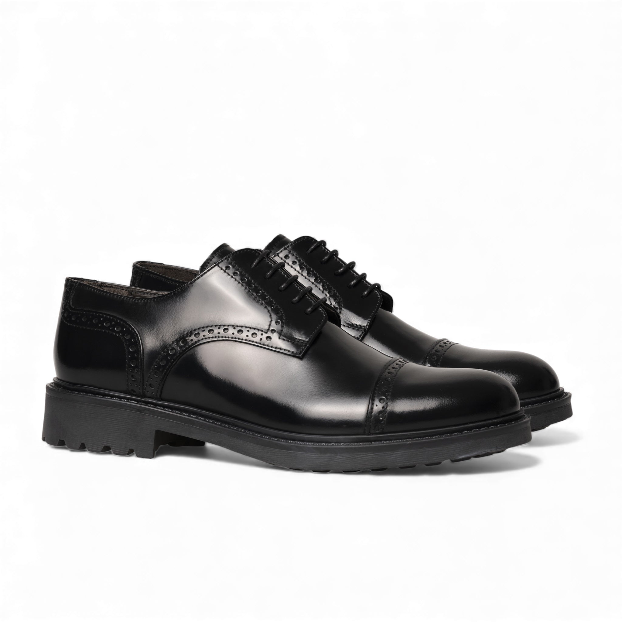 derby artigianale in pelle spazzolata nera con dettagli brogue e punta cap-toe, simbolo di eleganza classica reinterpretata in chiave contemporanea. La finitura lucida valorizza la tomaia e dona profondità al design, mentre la suola carrarmato in gomma offre grip, stabilità e comfort durante tutta la giornata.